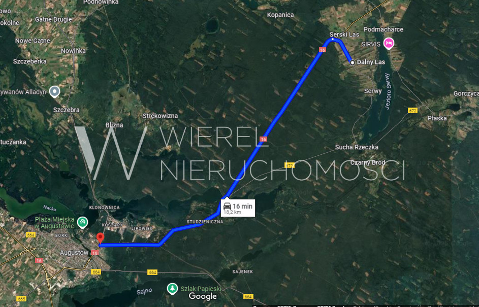 Powierzchnia działki to nieco ponad 1000 m² (wymiary: 20 m x 50 m). Jest położona w malowniczej miejscowości Dalny Las, zaledwie 15 minut jazdy samochodem od Augustowa.