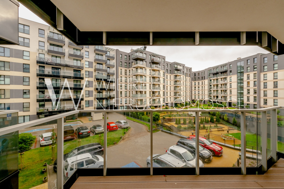 przestronnego salonu z aneksem kuchennym, dwóch sypialni, eleganckiej łazienki z prysznicem, oraz dużego balkonu z widokiem na wewnętrzny dziedziniec kompleksu (ul. Czarna / Młynowa / Wyszyńskiego).