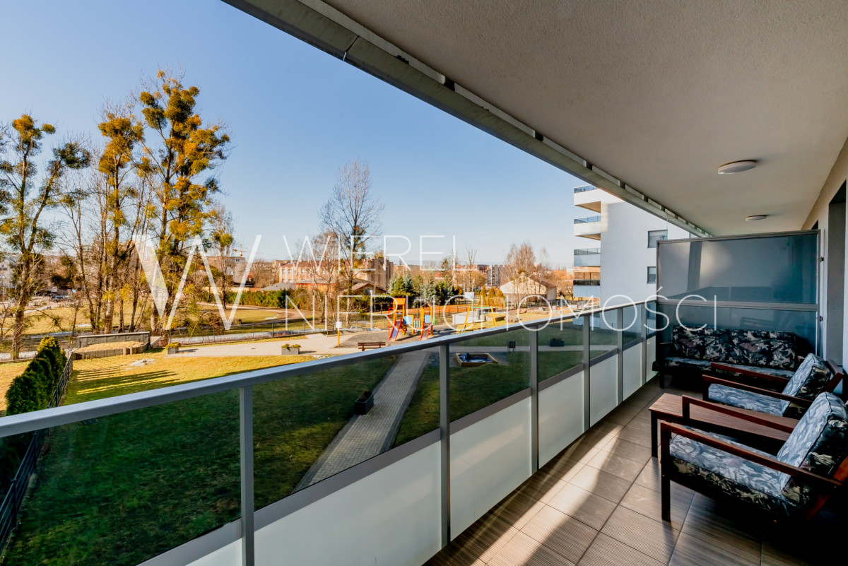 bardzo duży balkon typu loggia, który w praktyce pełni funkcję tarasu i stanowi doskonałą przestrzeń do relaksu
